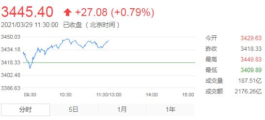 3月29日,星期一,農曆二月十七。今日早盤,A股三大指數集體高開,高開後經短暫調整,隨後開始震蕩上行。滬指在10點半左右來到上午最高點3449.83點。深成指和創業板指走勢與滬指類似,漲幅也基本相當。盤面上看,煤炭、白酒、造紙等板塊漲幅居前,數字貨幣、電力股異動拉升,環保工程、汽車、電子競技等板塊跌幅居前。資金情緒逐步回暖,兩市超過2200個股上漲。
