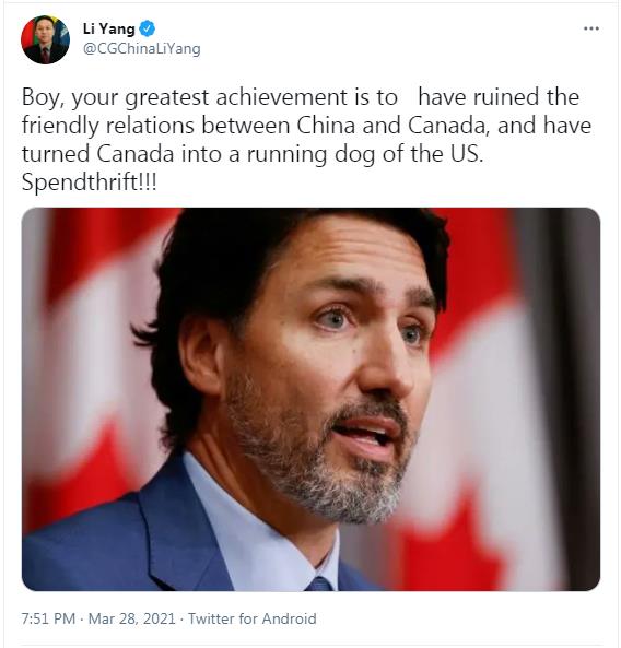 中國駐里約熱內盧總領事李楊周日(28日)在推特賬號上帖文,批評加拿大總理杜魯多最大的功績就是破壞了中加兩國的友好關係,把加拿大變成了美國的走狗。李楊在推特賬號上傳了一張加拿大總理杜魯多的照片,並配文稱:「小子,你最大的功績就是破壞了中加兩國的友好關係,把加拿大變成了美國的走狗。敗家子!!!」