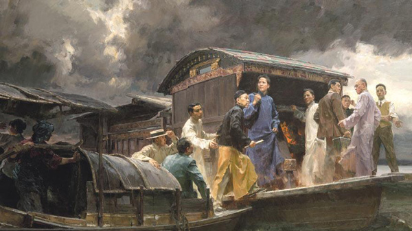 何紅舟、黃髮祥 油畫 《啟航——中共一大會議》。圖片來源中國共產黨新聞網。
