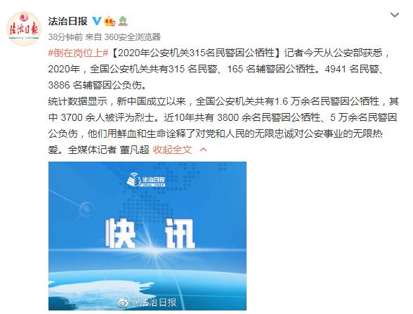 據法治日報官方微博今日消息,公安部透露,2020年,全國公安機關共有315名民警、165名輔警因公犧牲。4941名民警、3886名輔警因公負傷。