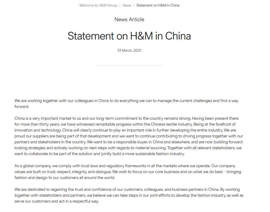 3月31日,H&M在一份聲明中表示,公司對中國市場的長期承諾「依然堅定」,公司希望做「負責任的採購者,不論在中國還是世界其他地方」。
