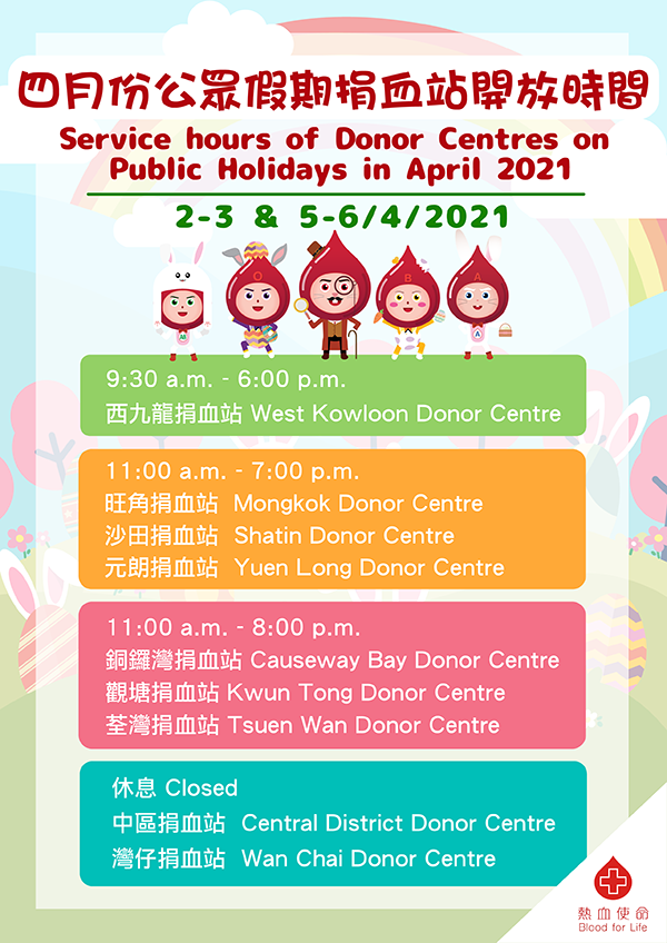輸血服務中心指大部分捐血站在復活節假期期間照常開放,而位於灣仔告士打道7號入境事務大樓地下3號室的新捐血站已於本周初投入服務,服務時間為星期一至五上午10時至下午6時;中心提醒捐血者需要致電熱線6392 5778預約在灣仔捐血站之捐血時段。