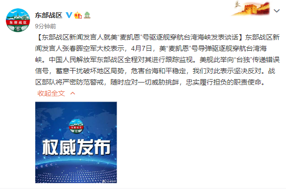 張春暉表示,4月7日,美「麥凱恩」號導彈驅逐艦穿航台灣海峽。中國人民解放軍東部戰區全程對其進行跟蹤監視。「美艦此舉向『台獨』傳遞錯誤信號,蓄意干擾破壞地區局勢,危害台海和平穩定,我們對此表示堅決反對。」