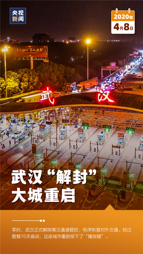 2020年,一場突如其來的新冠肺炎疫情席捲武漢。為了防止疫情進一步擴散,1月23日,這座享有「九省通衢」美譽的城市關閉了所有離漢通道。76天的全力抗疫,武漢挺過來了,2020年4月8日0時,離漢通道管控措施正式解除。