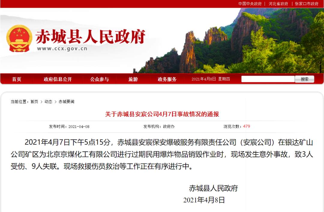 4月8日,河北赤城縣發布通報,2021年4月7日下午5點15分,赤城縣安宸保安爆破服務有限責任公司(安宸公司)在銀達礦山公司礦區為北京京煤化工有限公司進行過期民用爆炸物品銷毀作業時,現場發生意外事故,致3人受傷、9人失聯。現場救援傷員救治等工作正在有序進行中。(資料圖片)