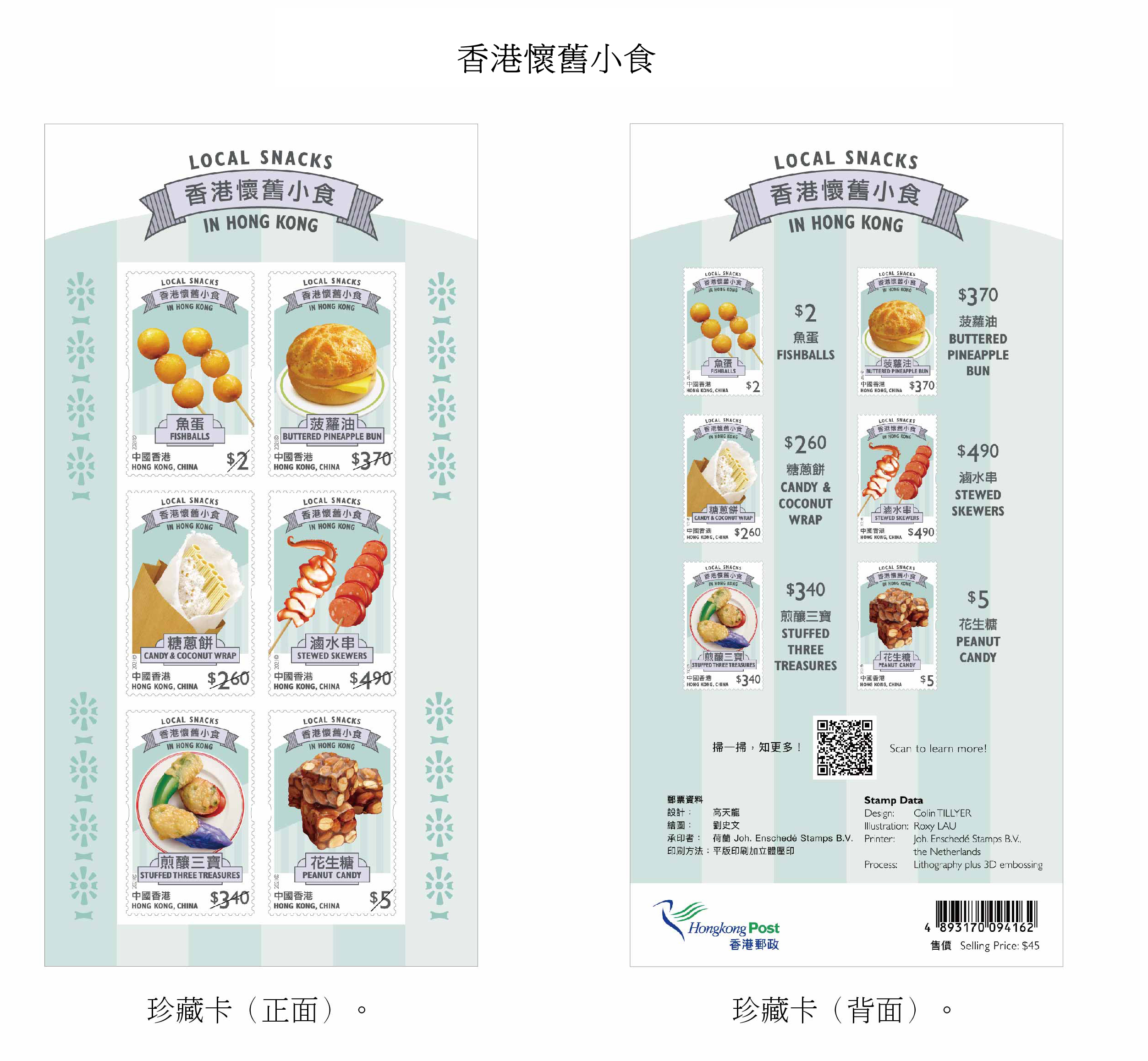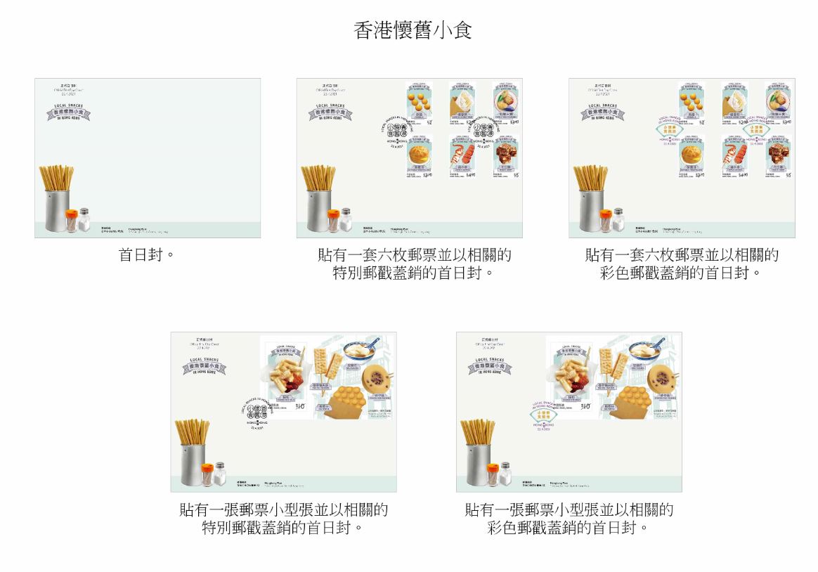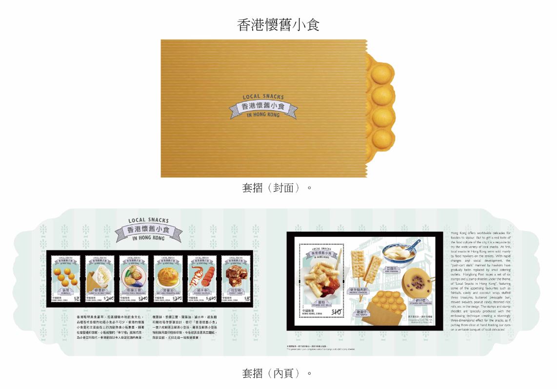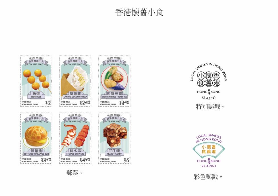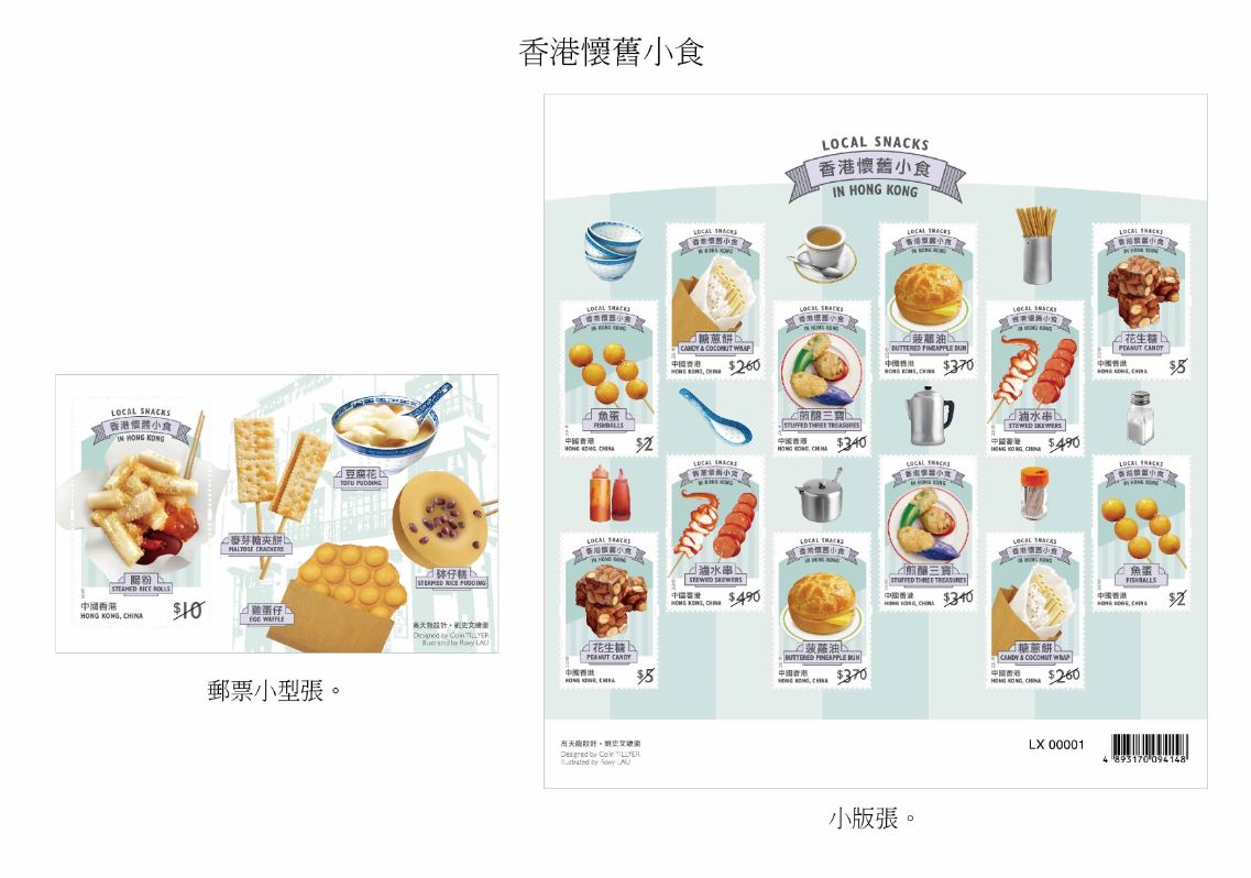 香港郵政指特別郵票分別繪有糖蔥餅、菠蘿油、花生糖的地道小食;郵票小型張則展示香滑腸粉、豆腐花、麥芽糖夾餅、砵仔糕及雞蛋仔這些懷舊小食。
