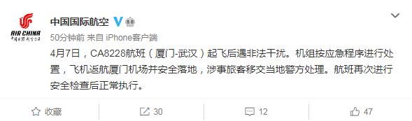據中國國際航空官方微博今日消息,國航CA8228航班於4月7日晚10時35分起飛後,有乘客在機艙中聲稱「機上有炸彈」,隨後該航班返航廈門高崎國際機場。經警方現場檢查,未在飛機上發現爆炸物,出警民警將該乘客帶回公安機關做進一步調查。隨後,航班重新起飛。第三方航班信息軟件顯示,該航班已於8日4時54分抵達武漢天河國際機場。