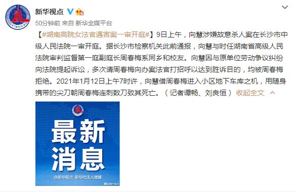 9日上午,向慧涉嫌故意殺人案在長沙市中級人民法院一審開庭。據長沙市檢察機關此前通報,向慧與時任湖南省高級人民法院審判監督第一庭副庭長周春梅系同鄉和校友。向慧因與原單位勞動爭議糾紛向法院提起訴訟,多次請周春梅向辦案法官打招呼以達到勝訴目的,均被周春梅拒絕。2021年1月12日上午7時許,向慧借周春梅進入小區地下車庫之機,用隨身攜帶的尖刀朝周春梅連刺數刀致其死亡。