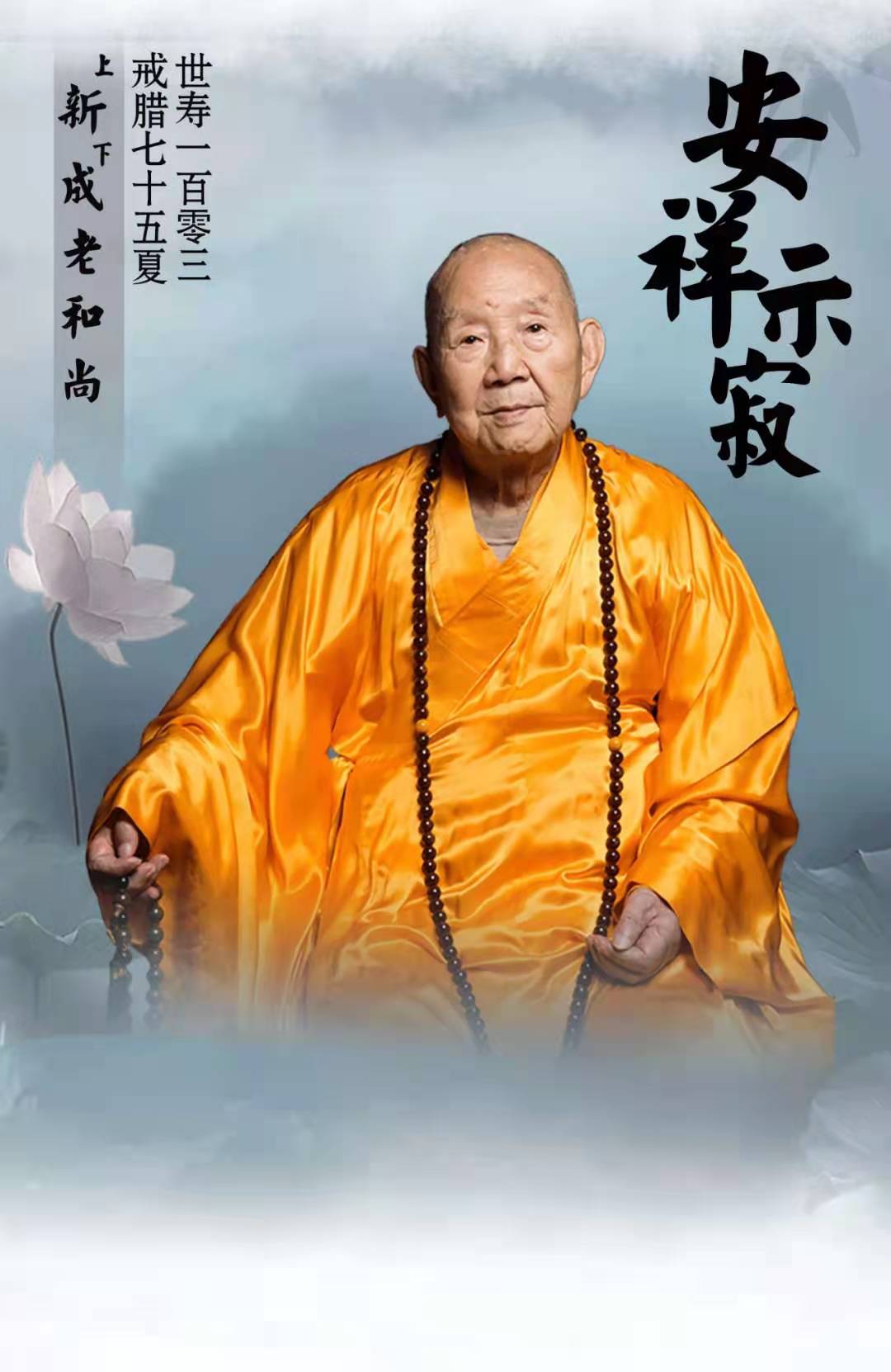 新成長老於2021年4月4日23時35分(農曆辛丑年二月二十三日)在廣州光孝寺安詳示寂,享年103歲,僧臘77年,戒臘75夏。 4月9日11:00,新成長老圓寂追思法會在廣州光孝寺舉行。此活動由中國佛教協會主辦,廣東省佛教協會、海南省佛教協會、廣州市佛教協會、廣州光孝寺承辦。