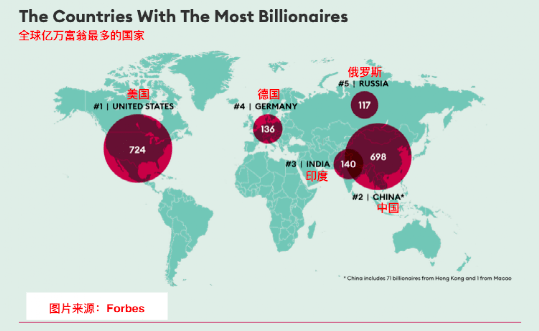 印度的億萬富翁人數在全球排名第三,為140人。來自亞太地區的1149位億萬富翁的總資產為4.7萬億美元,而美國億萬富翁的資產為4.4萬億美元。