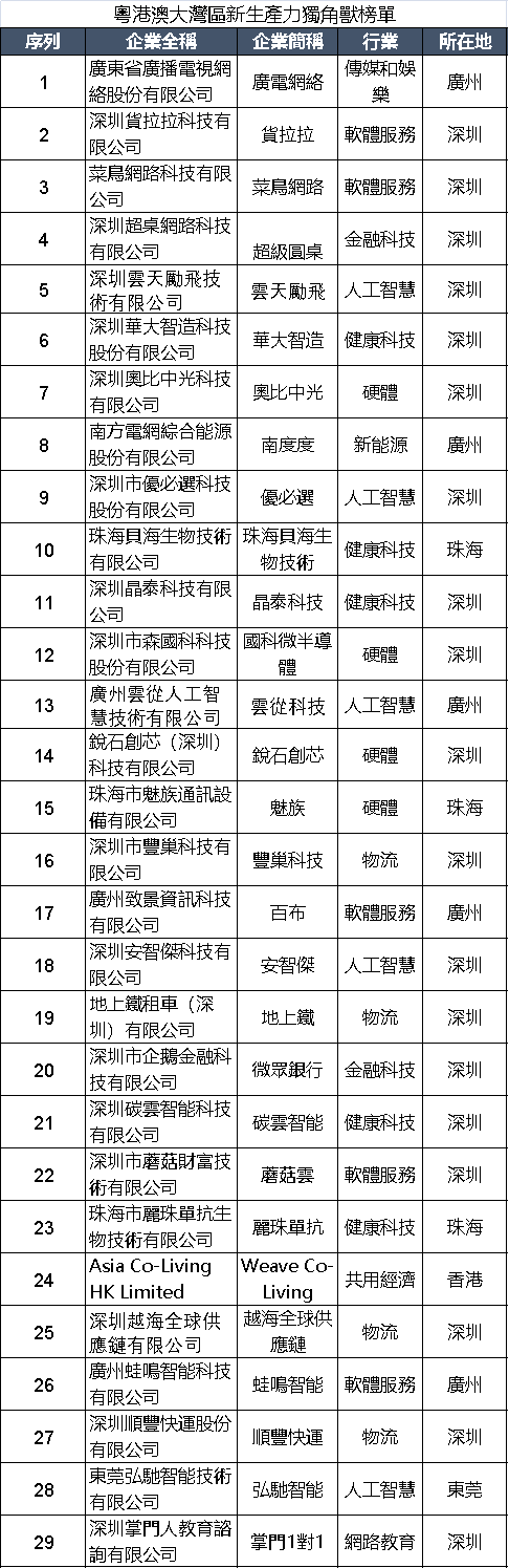 《2021粵港澳大灣區新生產力獨角獸企業榜單》今日(10日)上午在深圳發布,共有29家企業。