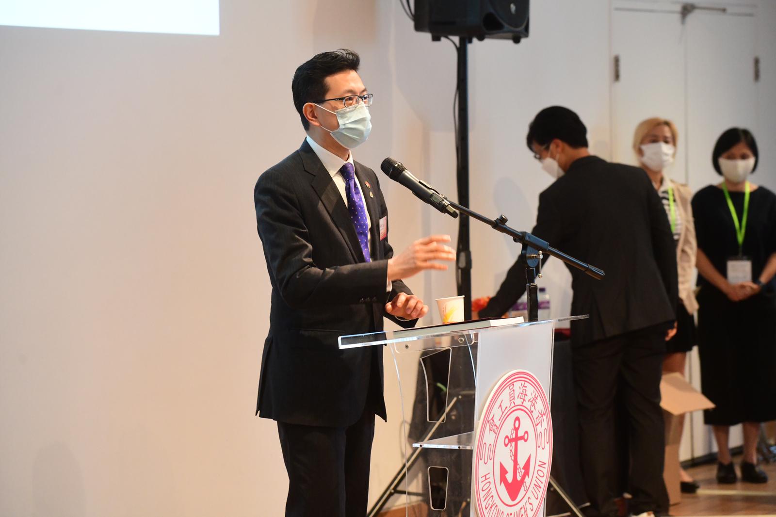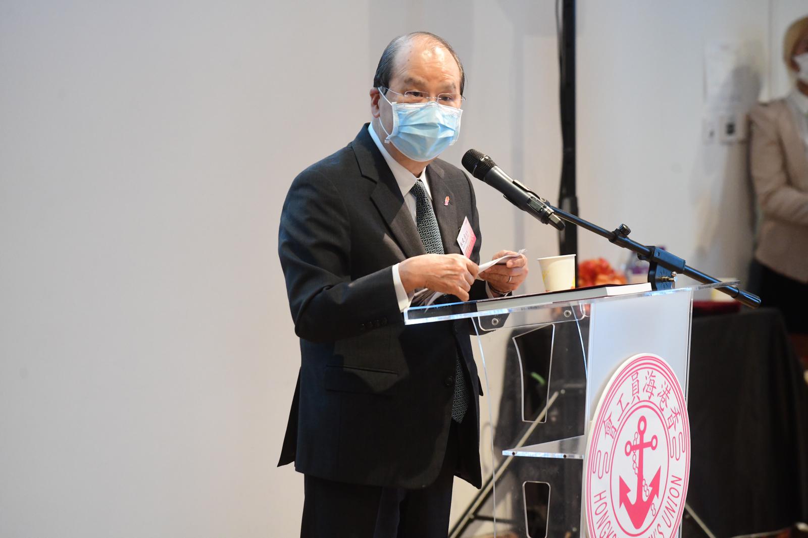 張建宗致辞時表示,香港能成為國際航運中心全靠歷代香港海員的奮鬥,希望你們繼續努力,帶動香港發展高增值、高端的航運服務,吸引更多年青人入行。國家「十四五」規劃為香港發展帶來無限機遇,令香港航運業一片光明,令香港再次輝煌、重新踏上康莊大道。香港海員擁有傳統愛國精神,只有愛國者治港才能讓香港長治久安,《2021年完善選舉制度(綜合修訂)條例草案》將於4月14日在立法會特別加開會議上首讀,希望各位議員能夠支持。