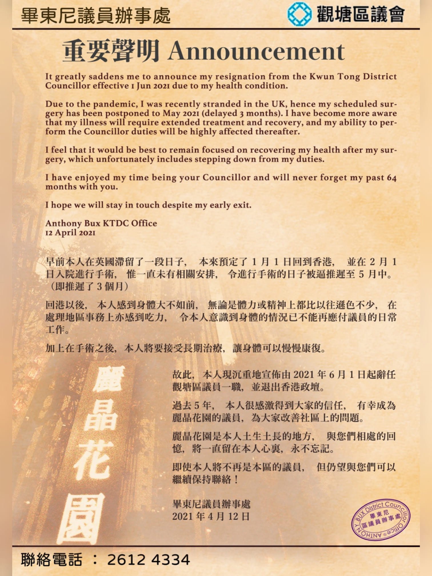 畢東尼稱,自己的身體在回港後大不如前,體力或精神上亦較以往遜色,在處理地區事務上亦感到吃力,令他意識到身體的情況已不能再應付議員的日常工作。他又指,在進行手術後,將要接受長期治療,讓身體慢慢康復。因此,他宣布由今年6月1日起辭任觀塘區議員一職,並退出香港政壇。