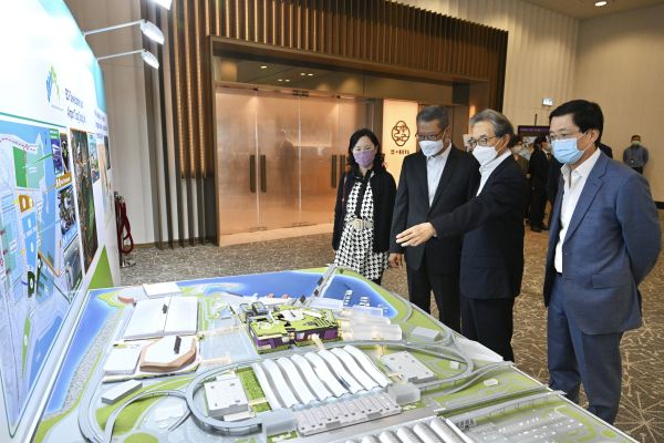 陳茂波聽取機管局主席蘇澤光講解「航空城」項目進展;旁為運輸及房屋局常任秘書長(運輸)陳美寶及機管局行政總裁林天福。