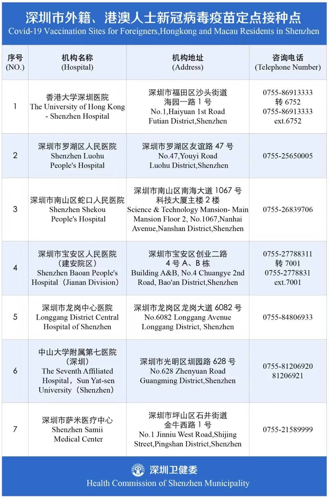 深圳市外籍、港澳人士新冠病毒疫苗定點接種點