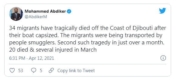 國際移民組織的聲明說,一艘偷渡船於當天淩晨在吉布提附近海域發生傾覆,釀成這一悲劇。國際移民組織東非地區總監Mohammed Abdiker在Twitter上稱,這些移民者是由走私者運送的。