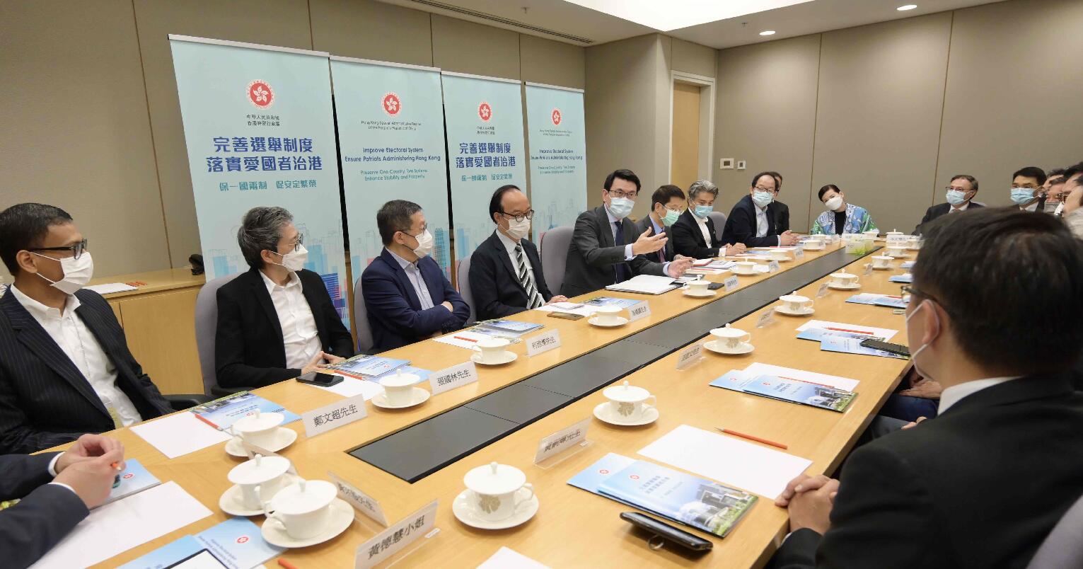 商務及經濟發展局局長邱騰華今日(13日)就完善香港選舉制度與廣播、電影、音樂、演藝界等代表會面,解說全國人民代表大會常務委員會通過新修訂《基本法》附件一《香港特別行政區行政長官的產生辦法》和附件二《香港特別行政區立法會的產生辦法和表決程序》的內容。