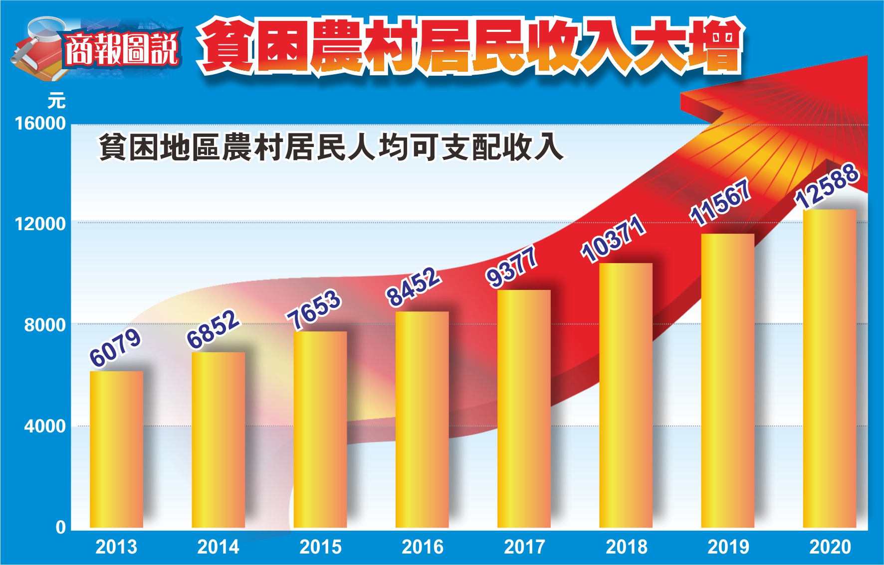 中國內地農村貧困人口全部脫貧,貧困地區農村居民人均可支配收入,從2013年的6079元增長到2020年的12588元,足足翻了一番。