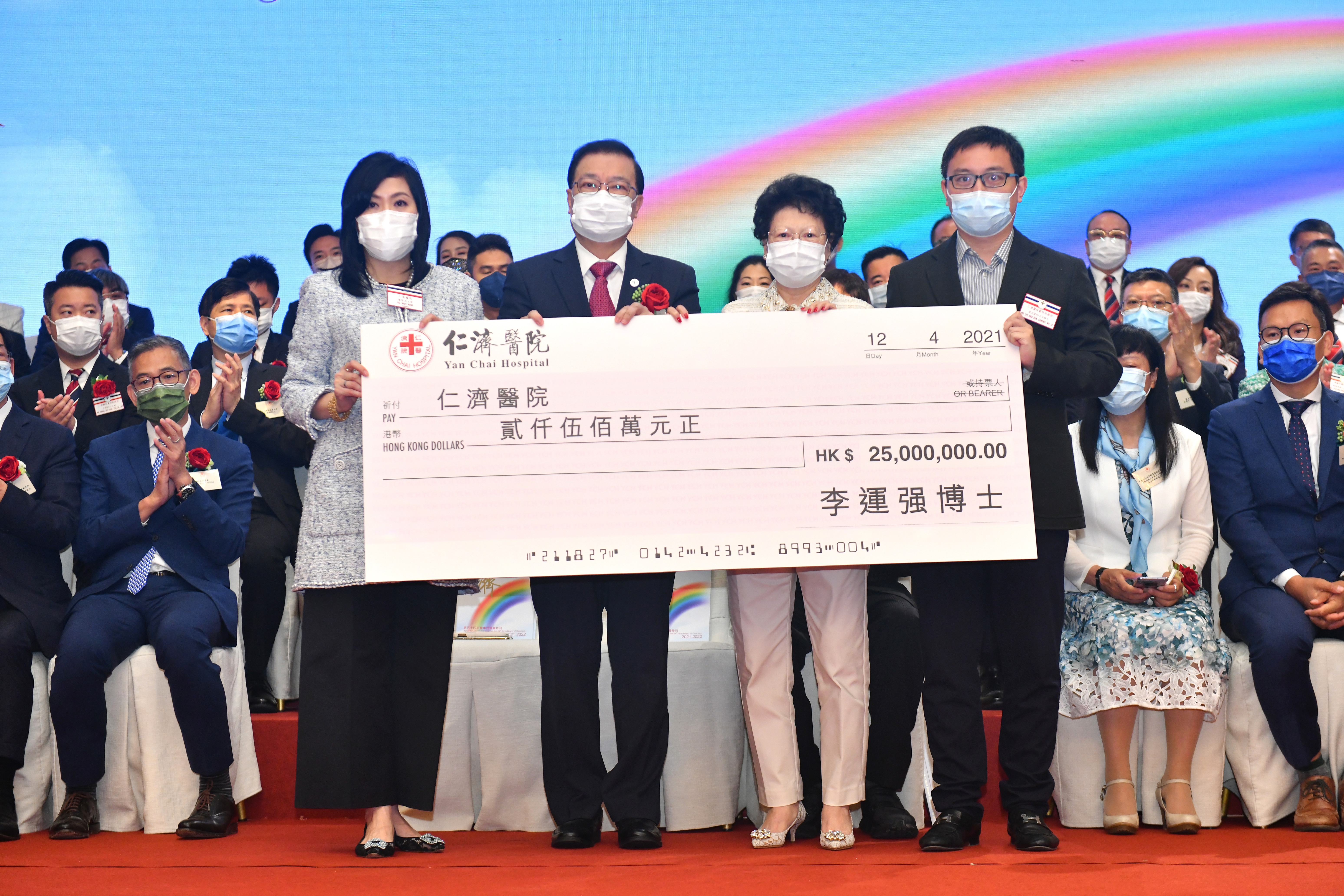 第54屆仁濟醫院董事局主席黃楚淇代表醫院接受李運強及英皇慈善基金的支票捐贈。