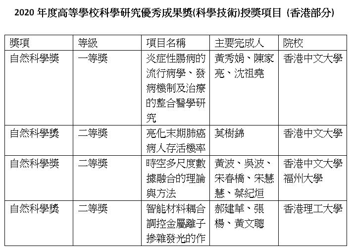 據介紹,2020年度教育部科技成果獎共頒289個獎項,香港學者共獲5個獎項,中大囊括其中3個。沈祖堯團隊獲一等獎課題的團隊成員還包括中大醫學院助理院長黃秀娟及院長陳家亮。中大醫學院莫樹錦則憑《亮化末期肺癌病人存活機率》獲二等獎。中大地理與資源管理學系的黃波,作為第一完成人帶領團隊憑《時空多尺度數據融合的理論與方法》,與福州大學分享二等獎。