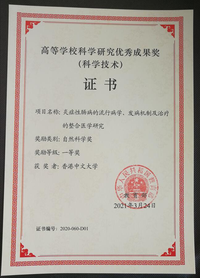 香港中文大學(中大)14日表示,國家教育部發放2021年1號文件公布2020年度高等學校優秀成果獎(科學技術)評審結果,中大醫學院沈祖堯團隊憑《炎症性腸病的流行病學、發病機制及治療的整合醫學研究》勇奪一等獎。