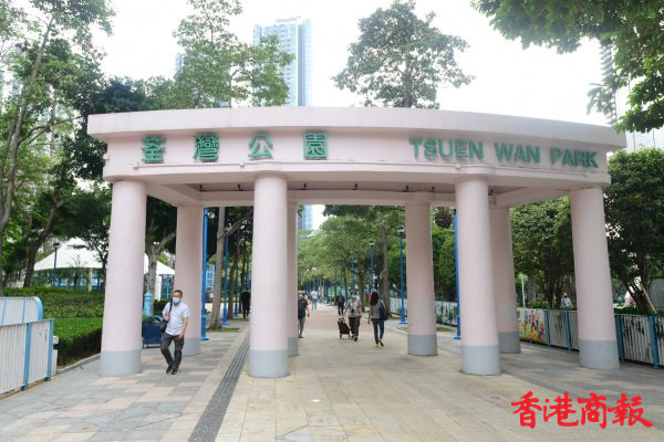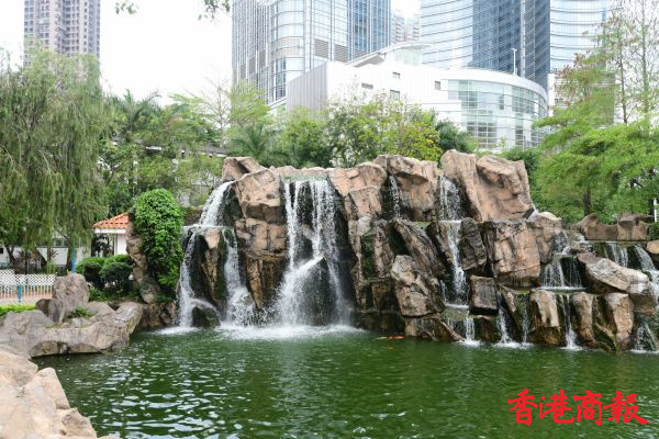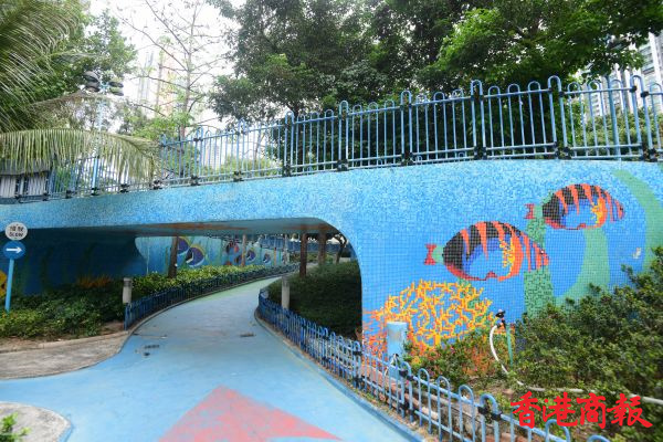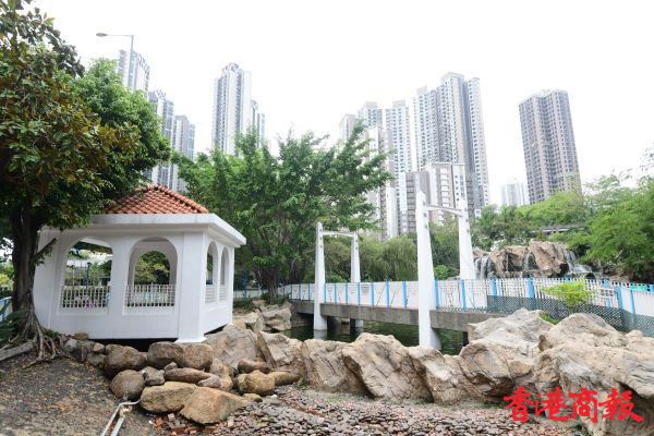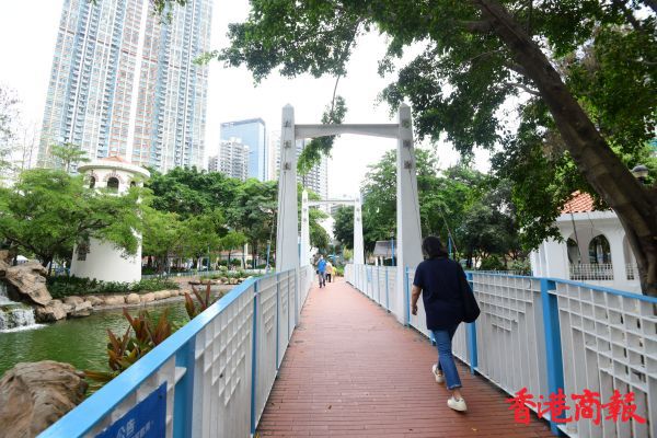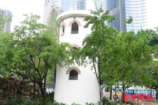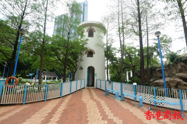 在荃灣公園有一座三層高的瞭望塔,可眺望整個公園外,最有「姆明之家」感覺正是瞭望塔門口,如卡通屋的粉藍色設計,感覺讓人如真的要進入姆明之家門口般;附近有一個露天劇場,背後建築如日本的尖頂教堂設計,隆重卻又帶點休閒格調。在前往人工瀑布的一條小橋上,只要駐足感受這個可愛的公園,彷如城市綠洲中也有一股清泉,令人回復童真。(崔俊良 攝)