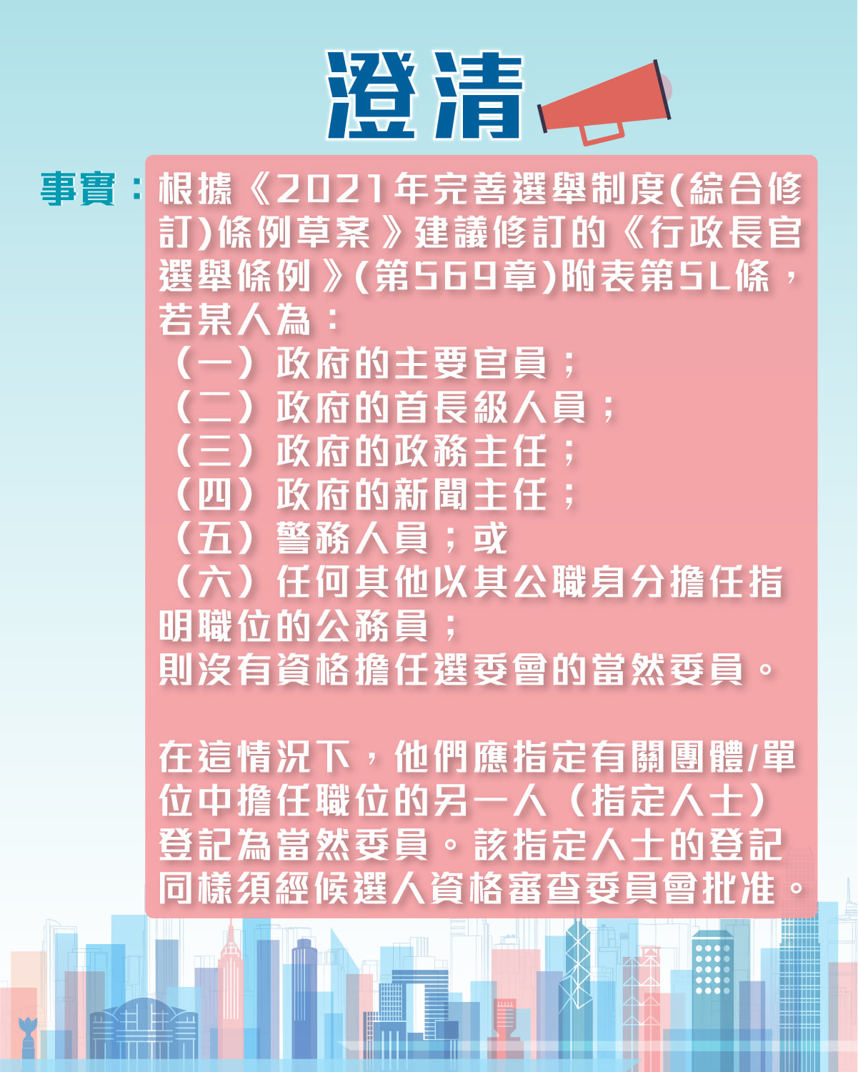 港府指,根據《2021年完善選舉制度(綜合修訂)條例草案》,建議修訂的《行政長官選舉條例》(第569章)的附表第5L條,若某人為(一)政府的主要官員;(二)政府的首長級人員;(三)政府的政務主任;(四)政府的新聞主任;(五)警務人員;或(六)任何其他以其公職身份擔任指明職位的公務員,則沒有資格擔任選委會的當然委員。在這情況下,他們應指定有關團體/單位中擔任職位的另一人(指定人士)登記為當然委員。該指定人士的登記同樣須經候選人資格審查委員會批准。