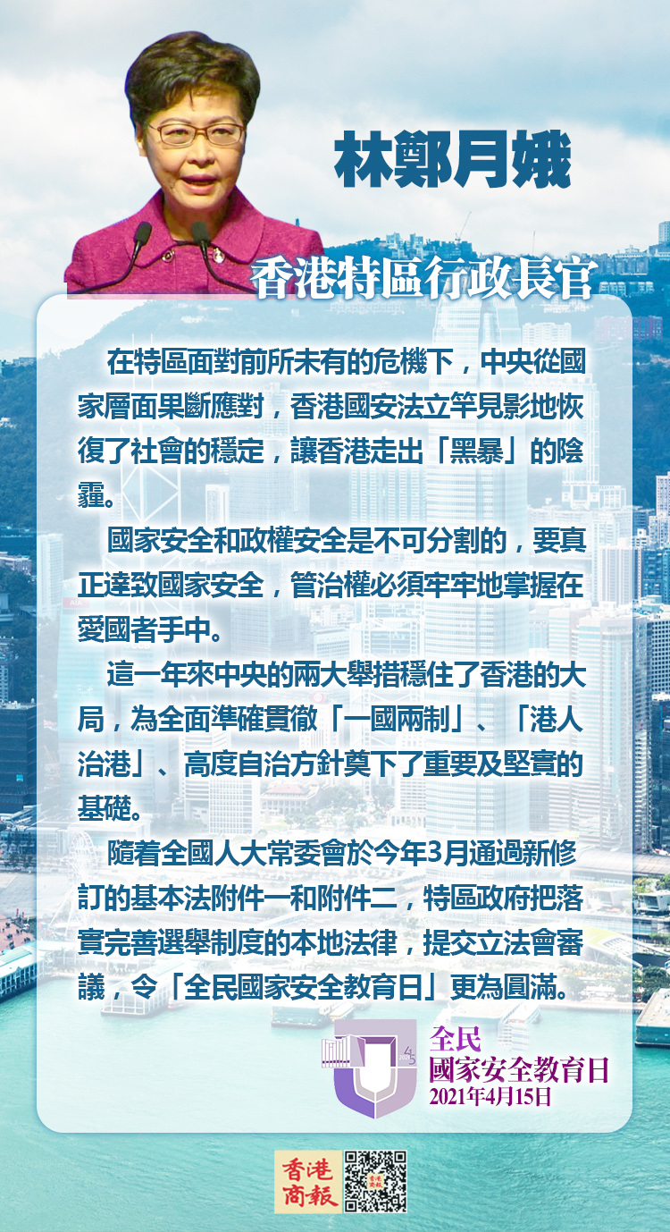 行政長官、國安委主席林鄭月娥15日於「全民國家安全教育日2021」開幕典禮致辭時表示,國家安全和政權安全不可分割,要真正達致國家安全,管治權必須牢牢地掌握在愛國者手中。她以香港特區國安委主席身份作出3點承諾:以總體國家安全觀概念推進香港維護國家安全的工作;動員全社會參與,務求做到「維護國安,人人有責」;公職人員應當在維護國家安全方面負有更重要任務。