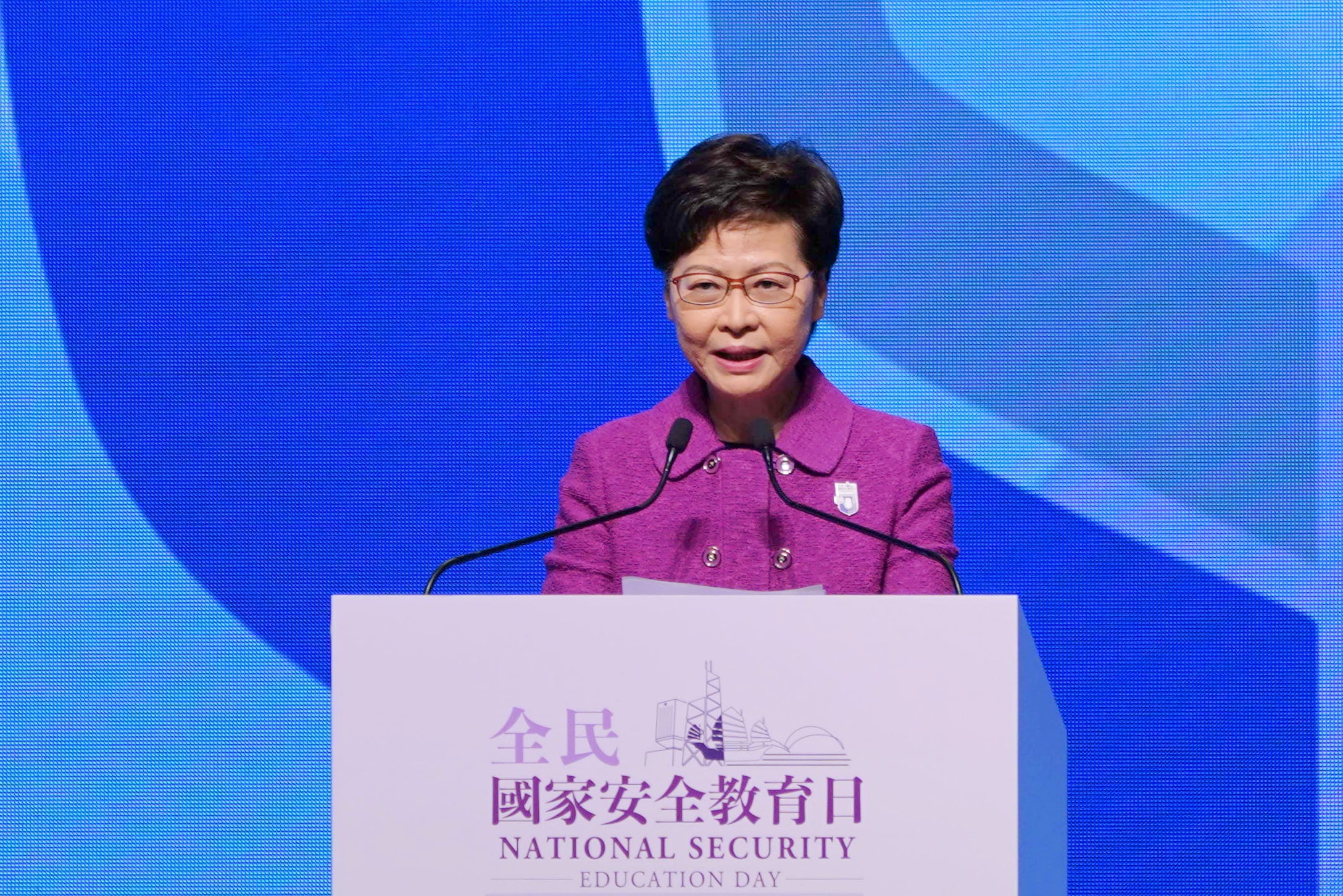 林鄭在「全民國家安全教育日2021」開幕典禮上致辭。中新社
