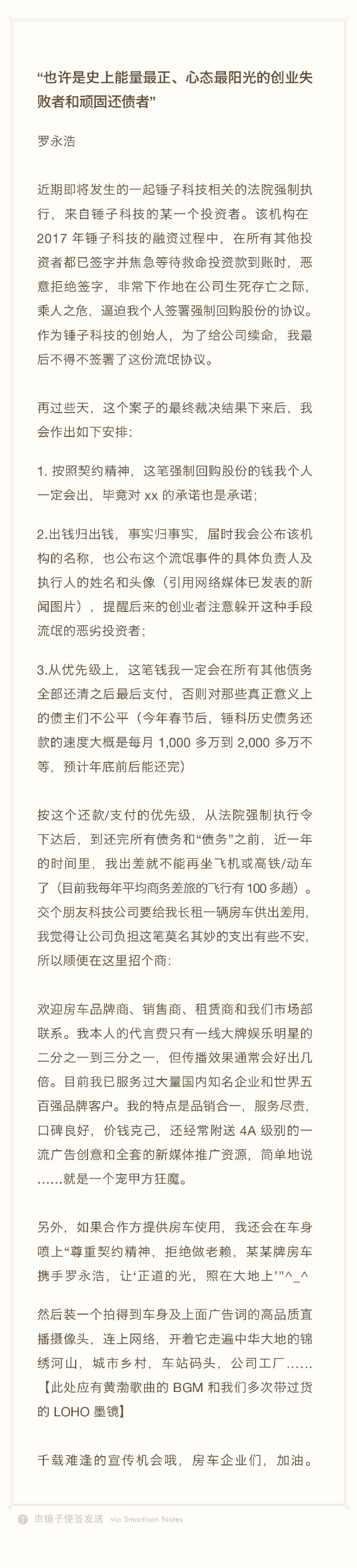 羅永浩表示,自己一定會還錢,並會公布這個機構的名字。在這期間,出差不能坐飛機高鐵,會乘坐房車。