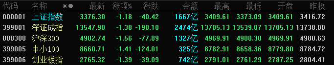 15日,兩市早盤震盪下跌,截至午間收盤,滬指跌1.18%,報收3376點;深成指跌1.38%,報收13547點;創業板指跌1.39%,報收2765點。滬股通淨流出16.4億,深股通淨流出24.7億。