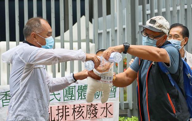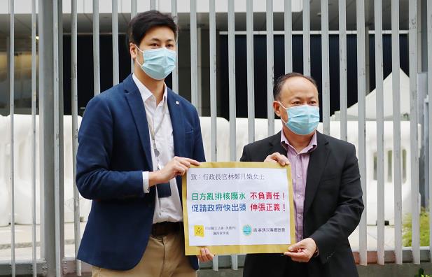 立法會議員何俊賢聯同香港漁民團體聯會今早(16日)到政府總部門前請願,就日本政府決定在兩年後以海洋排放方式處置福島核電站事故的核廢水事件,要求特區政府向國家相關部門作出反映及繼續對事態作出密切關注,並向日方的橫蠻行為作出強烈的抗議,保障特區政府及香港市民的權益。(記者 馮瀚文攝)