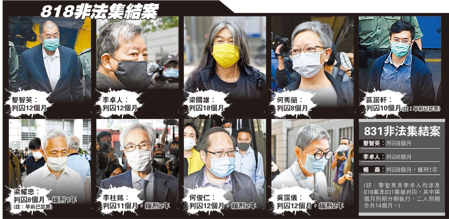 壹傳媒集團創辦人黎智英與8名反對派人士前年8月18日民陣集會後帶領群眾遊行到中環遮打道,前立法會議員區諾軒及梁耀忠早前認罪,其餘被告月初均被裁定兩項明知而參與及組織未經批准集結控罪罪成;另一方面,黎智英、前立法會議員楊森及李卓人因參與前年8月31日灣仔至中環遊行,上周三再承認一項明知而參與未經批准集結罪。兩案16日下午同於西九龍裁判法院由法官胡雅文判刑。黎智英及李卓人同涉818案及831案被判囚,其中2個月刑期分期執行,兩人刑期合共14個月;兩案其餘被告均被判囚8至18個月不等,部分被告獲准緩刑。