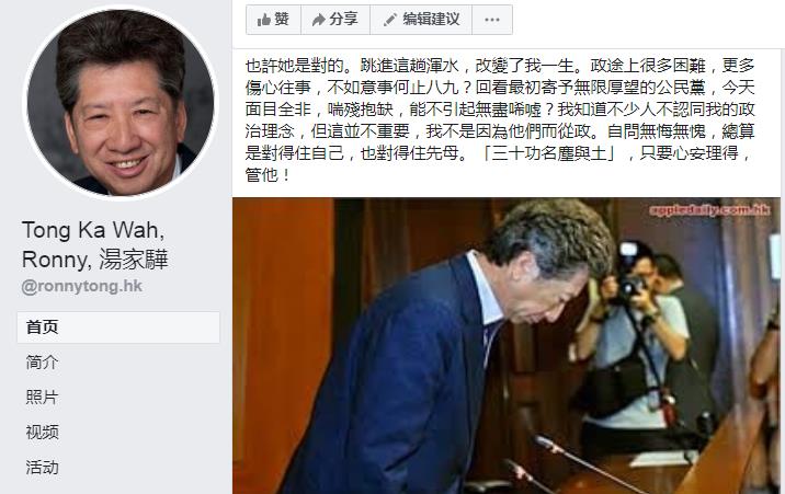 湯家驊感嘆,跳進這趟渾水,改變了自己一生。他在文中又說,政途上很多困難,更多傷心往事,不如意事何止八九?回看最初寄予無限厚望的公民黨,今天面目全非,喘殘抱缺,引起無盡唏噓。
