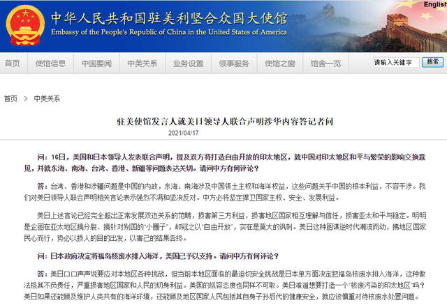 美日領導人發表聯合聲明,提及雙方將打造自由開放的印太地區,就中國對印太地區和平與繁榮的影響交換意見,並就東海、南海、台灣、香港、新疆等問題表達關切。中國駐美國大使館對美日聲明表示強烈不滿和堅決反對,強調中方必定會堅定捍衛國家主權、安全、發展利益。