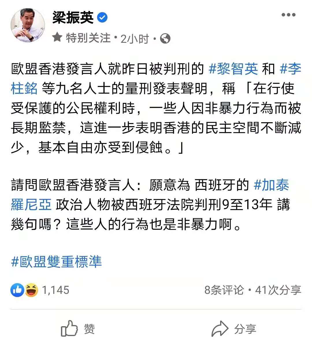 梁振英指不要雙重標準,歐盟香港發言人是否願意為西班牙的加泰羅尼亞政治人物被西班牙法院判刑9至13年講幾句嗎?這些人的行為也是非暴力啊。
