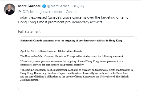 加拿大外交部長加爾諾(Marc Garneau)17日發表聲明稱,對香港法院針對10名民主派人士判決表達嚴重關切,指該10名香港「最傑出的民主派人士」因參與和平集會而「遭迫害」。