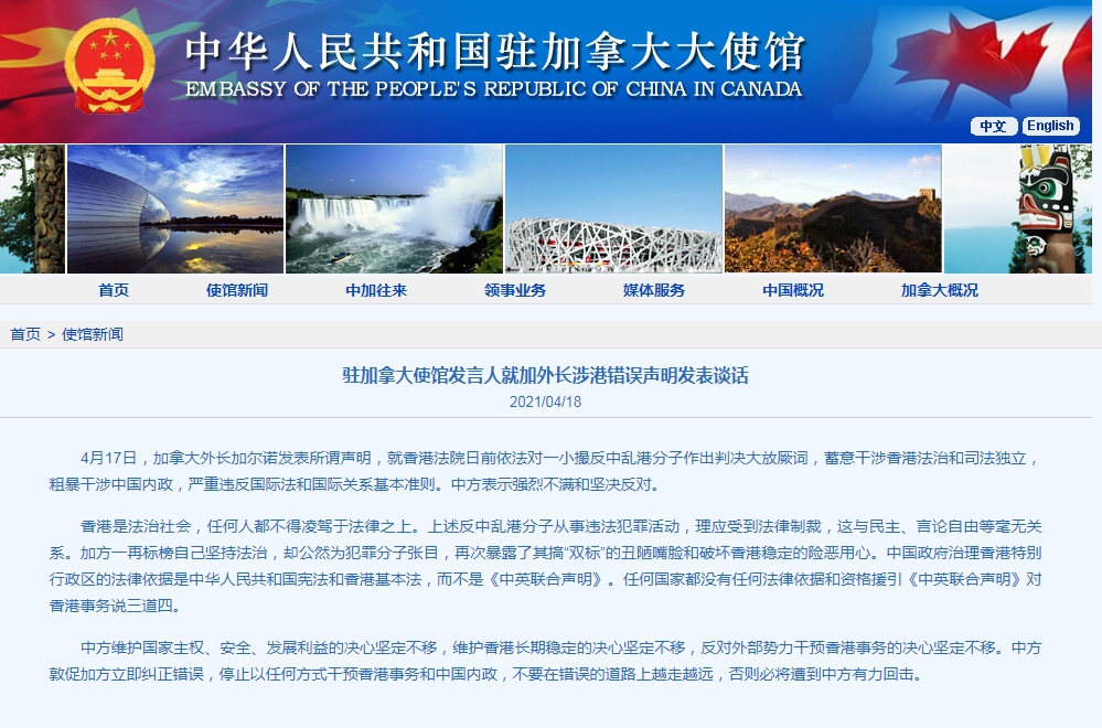 中國駐加拿大使館發言人4月17日就加拿大外長加爾諾(Marc Garneau)當日的涉港錯誤聲明作出回應,批評加方粗暴干涉中國內政,嚴重違反國際法和國際關係基本準則。