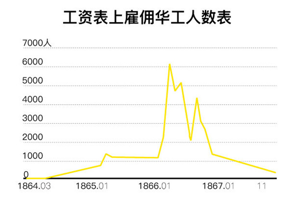 CP华工僱员的变动图显示,1865 年起大批华工参与修筑铁路。
