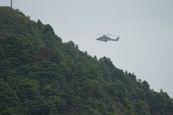 警方到飛鵝山現場搜證,直升機在上空盤旋協助。