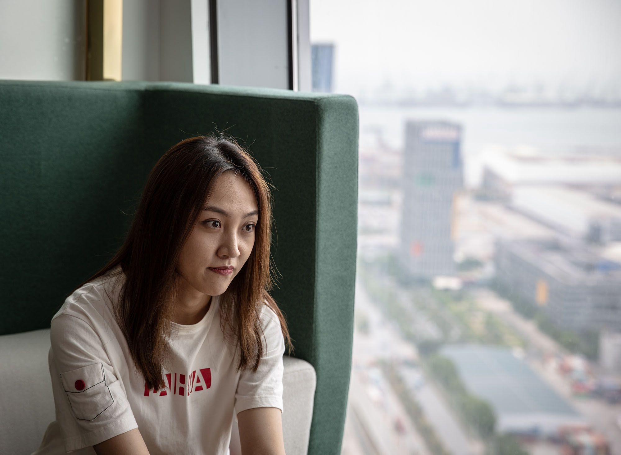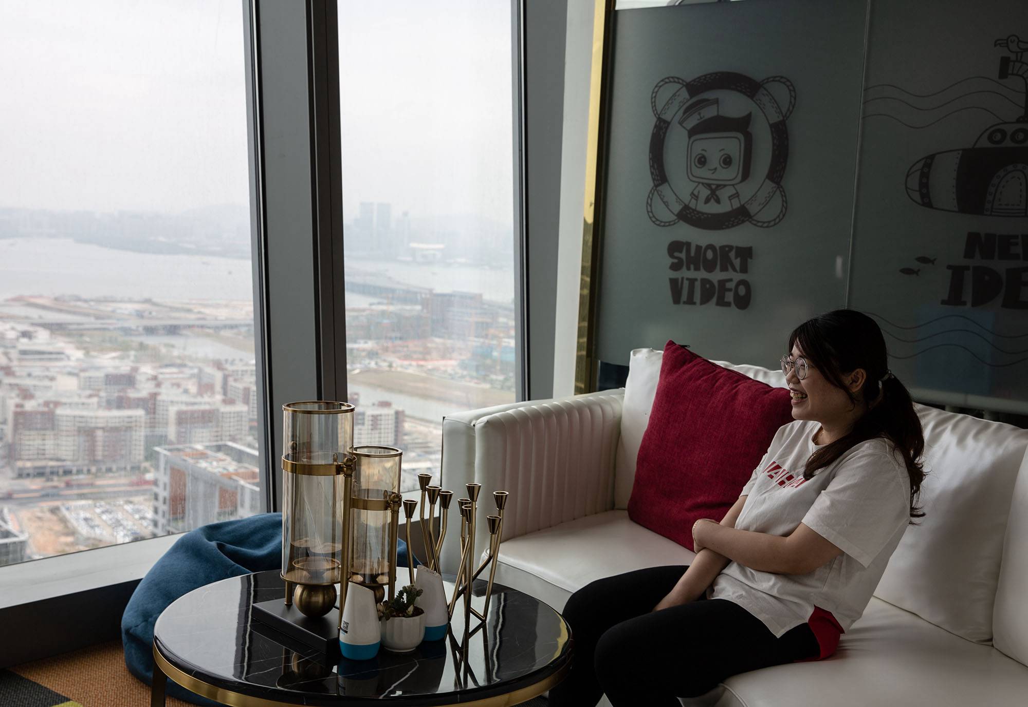 4月16日,廣東省深圳市前海世貿大廈,2000年出生的香港姑娘王一堯坐在公司的落地窗邊接受記者採訪,窗外是前海深港合作區的繁忙景象。臨近畢業時,她發現憑藉興趣選擇的文化類專業在香港就業前景不佳,就通過網絡找到了深圳的這家開發動畫視頻創作平台的企業,開始從事喜歡的美術相關工作。她說,願意在這裏一直幹下去。在這家名為前海手繪科技文化有限公司的創業企業里,像她一樣來自香港的年輕人還有30餘名。 (李崢苨/攝)