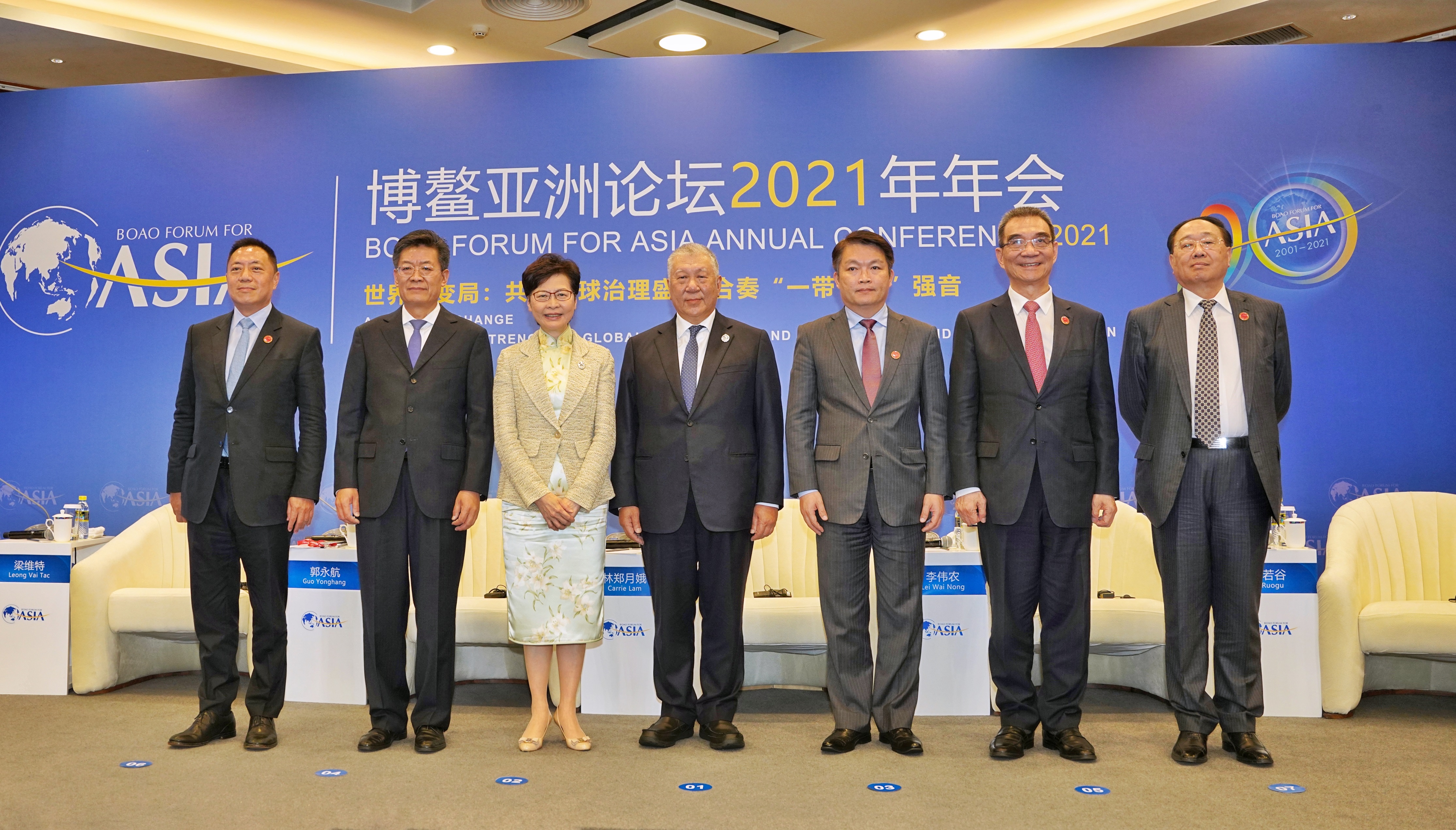 左起為博鰲亞洲論壇粵港澳大灣區建設澳門委員會主席梁維特、珠海市委書記郭永航、林鄭月娥、全國政協副主席何厚鏵、澳門經濟財政司司長李偉農、北京大學國家發展研究院林毅夫教授及中國國際經濟關係學會會長李若谷。
