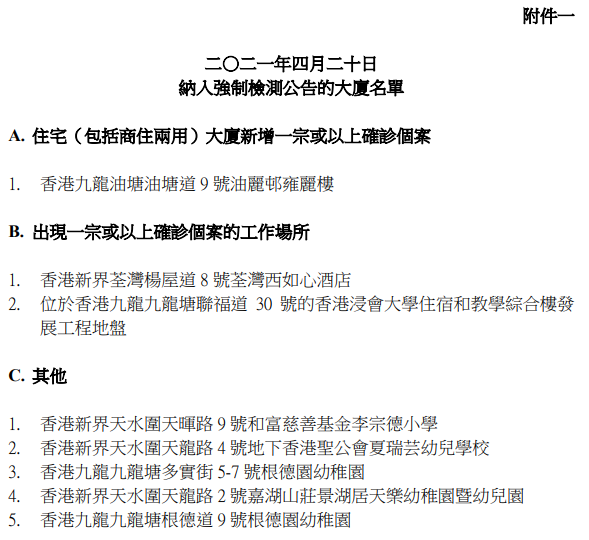 4月20日晚,港府宣布再多八棟大廈或地點被納入強制檢測。包括出現確診個案的油塘油麗邨雍麗樓、荃灣如心酒店、九龍塘浸會大學住宿和教學綜合樓發展工程地盤。