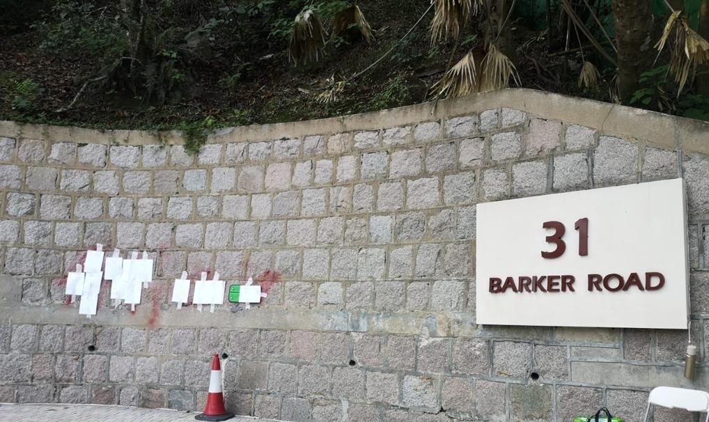 香港島山頂白加道31號大宅外石牆,今晨遭人以紅漆噴污,地上遺下一批懷疑追債字條。警方將案列作刑毀,暫未有人被捕。