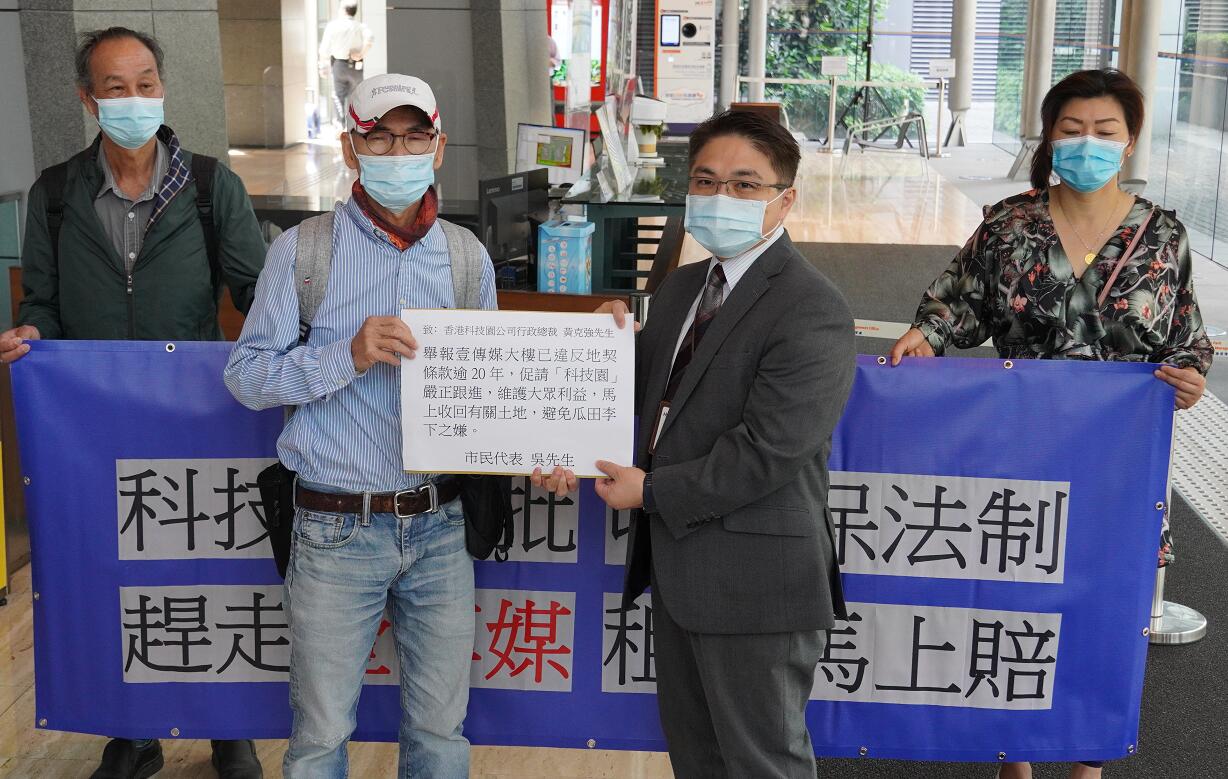 一批市民今日(21日)到負責管理將軍澳工業邨營運的香港科技園公司,投訴壹傳媒涉嫌多年來違反租約,把部分大樓用地租予其他公司營運牟利,並促請香港科技園公司嚴肅跟進,徹查是否涉及包庇違法詐騙行為,並根據租約條款收回壹傳媒大樓。