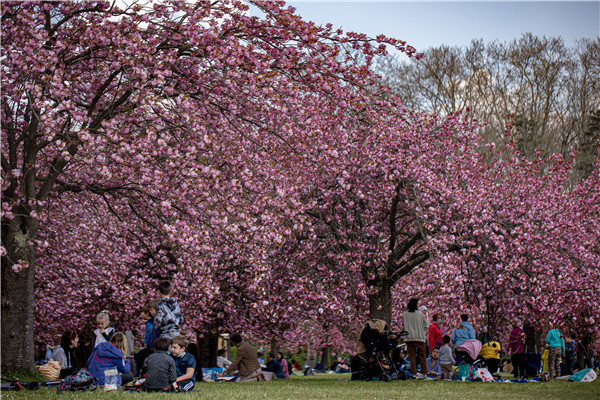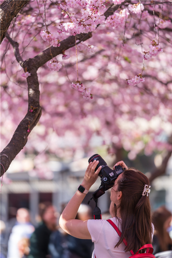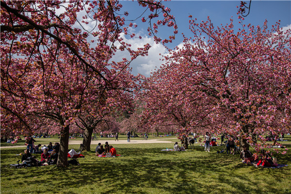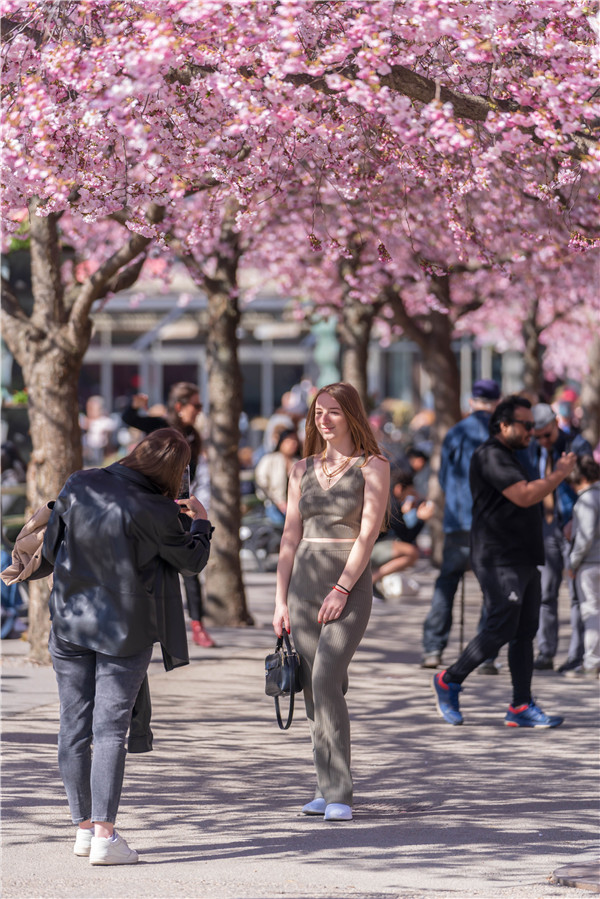 4月20日,瑞典斯德哥爾摩市中心的國王花園,人們在盛開的櫻花樹下拍照。