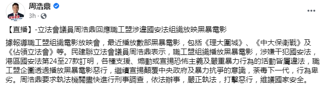 周浩鼎指,職工盟組織播放「黑暴」電影,涉嫌干犯香港國安法中第24至27款,條款訂明支援、煽動或宣揚恐怖主義及嚴重暴力行為的活動皆屬違法。他說,職工盟企圖透過播放「黑暴」電影惡行,繼續宣揚顛覆中央政府及暴力抗爭的意識,荼毒下一代,行為卑劣。周浩鼎呼籲執法機關盡快進行刑事調查,依法辦事,嚴正執法,打擊惡行,維護國家安全。