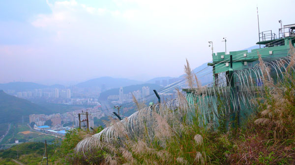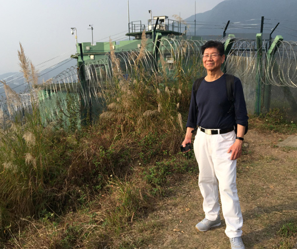 廖虹雷在新界蓮麻坑村山上往山下的深圳長嶺村眺望。