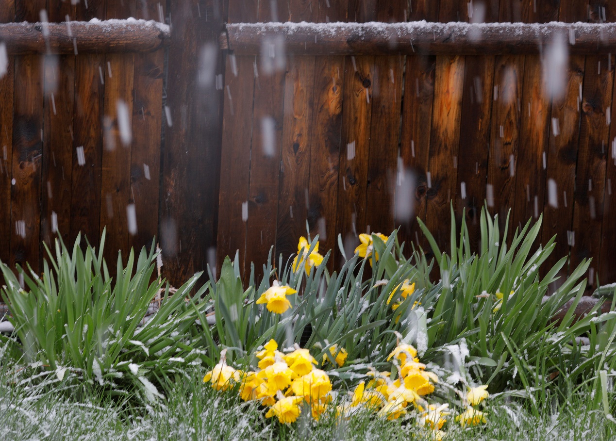 當地時間4月16日,在美國麻州梅德福市,清晨有雪落在水仙花上。