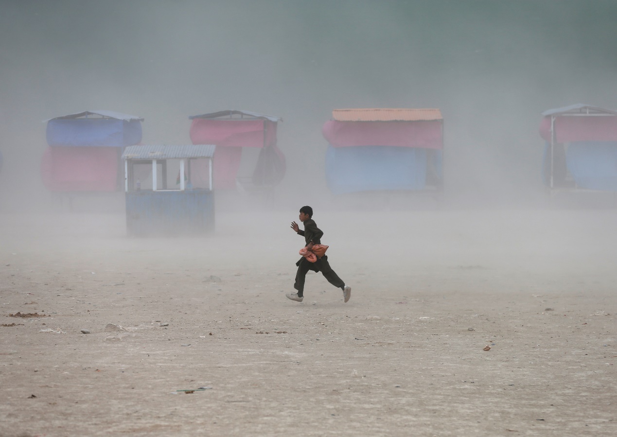 當地時間4月20日,阿富汗發生沙塵暴,一個男孩正在沙塵暴中奔跑。